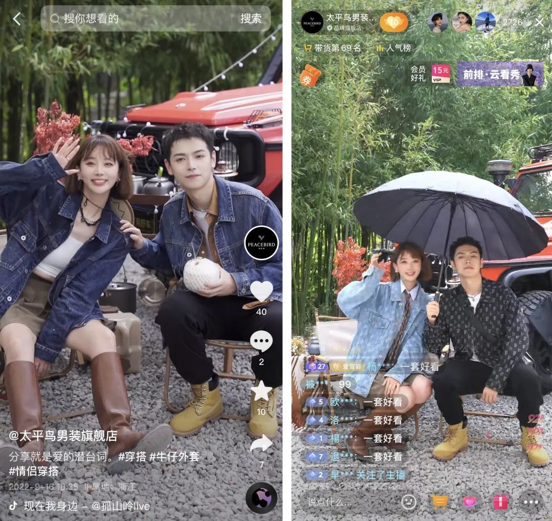 在自然禀赋的基础上,洛氪迅为布景增添了更多的色彩以及元素搭配——包括房车、篝火、露营灯、露营椅等软装。“在小范围内,使用不高的成本实施精细化布景,我们想给用户营造一种‘精致感’。”同时,这种色彩质感也和太平鸟当季主推的产品搭配起来,让画面充满活力。太平鸟直播间单场直播观看-成交转化率增幅61%;大热废墟营地场景高光场次对比日常场次,自然推荐流量占比增幅25%。