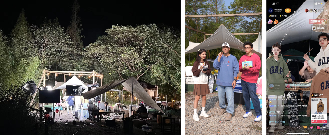 刚过中秋气温渐凉,在9月17-18日两天,服务商上海星帼文化传媒有限公司为GAP官方直播间的用户们带来了每天超过18小时直播,以天幕、帐篷、烧烤搭出户外露营的场景,再用童年游的盲盒公仔立牌等装饰作为软装背景。“舒适感”、“趣味性”,与品牌当季秋冬产品的温暖熨帖合二为一,成为直播间里的关键词。