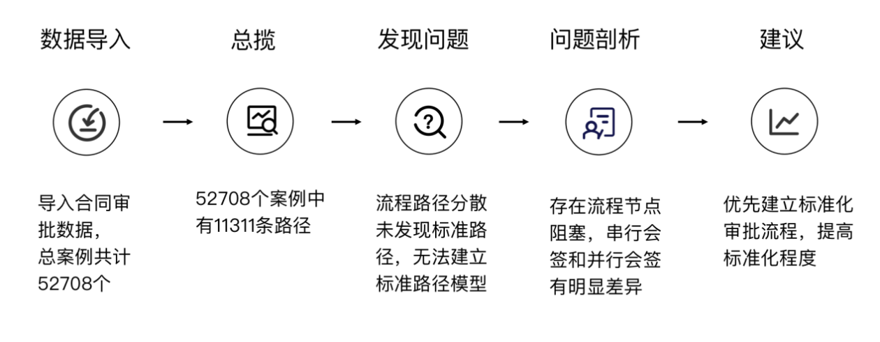 在服务的过程中,望繁信发现该集团目前的合同审批流程缺少标准化流程,且流程不可视,流程整体耗时长、效率低。另外,该集团还有一个典型问题就是流程极多,管理层面临审批量大、审批不及时的问题,且有较多重复审批返工审批,无法探知根因,这意味着流程无从优化。