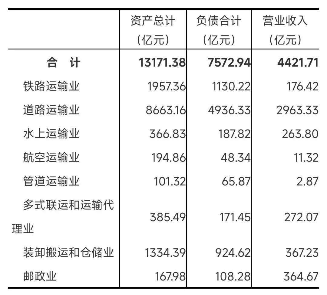 2023年末,交通运输、仓储和邮政业企业法人单位资产总计13171.38亿元,比2018年末增长80.8%;负债合计7572.94亿元,比2018年末增长62.2%。