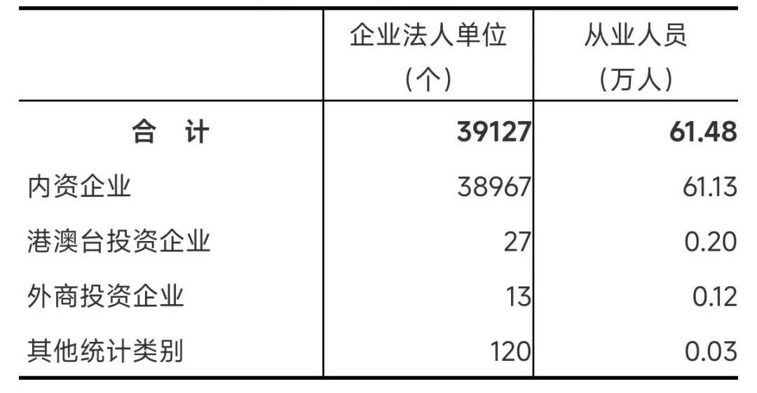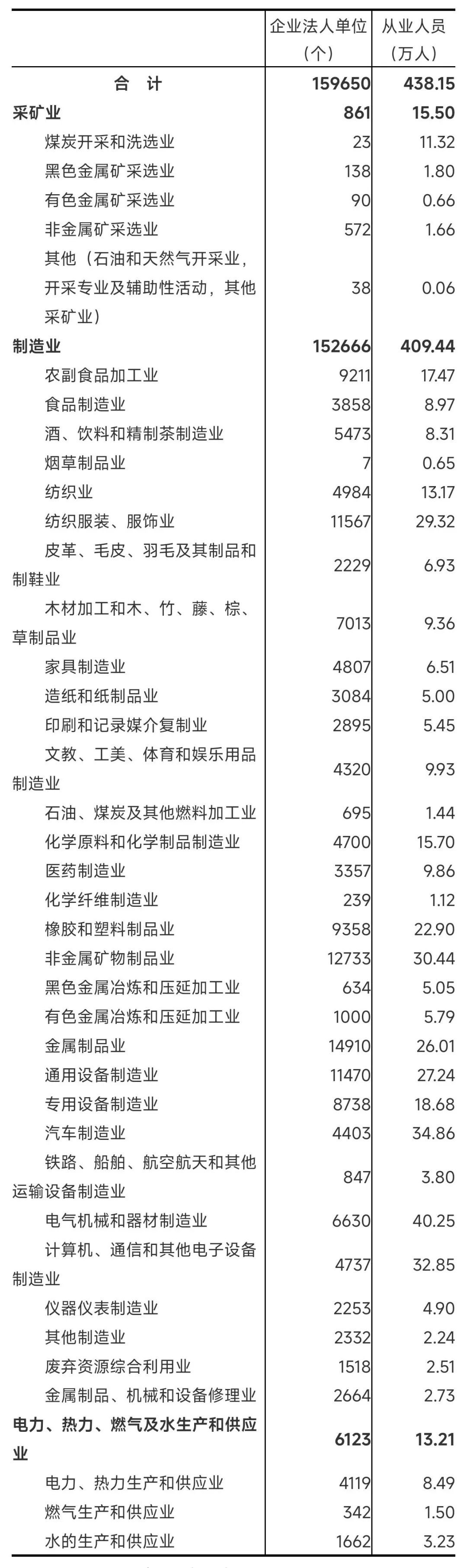 在工业企业法人单位中,采矿业861个,制造业152666个,电力、热力、燃气及水生产和供应业6123个,分别占0.5%、95.6%和3.8%。在工业行业大类中,金属制品业、非金属矿物制品业、纺织服装服饰业企业法人单位数位居前三位,分别占9.3%、8.0%和7.2%。