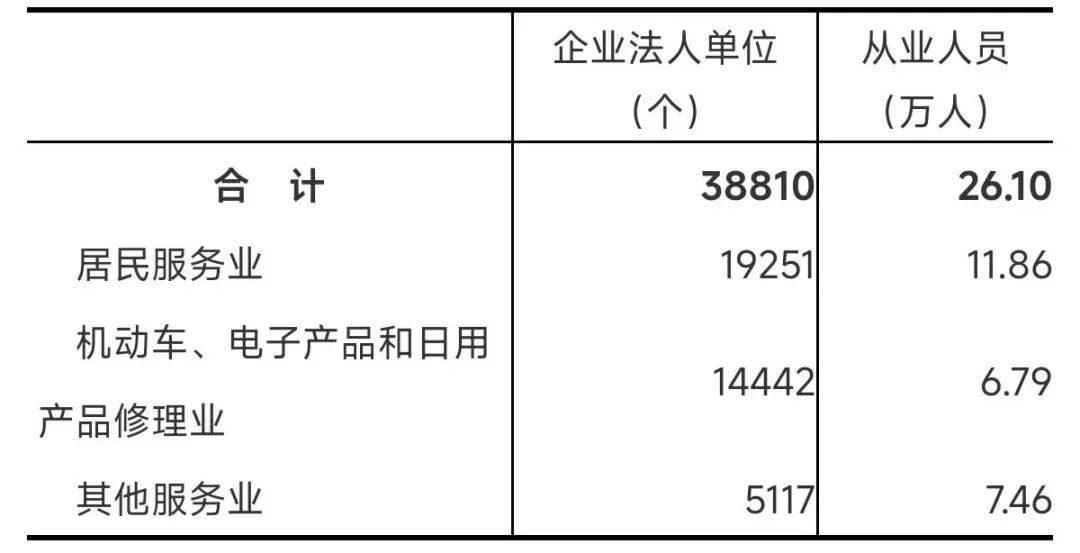 2023年末,全省共有居民服务、修理和其他服务业企业法人单位38810个,从业人员26.1万人,分别比2018年末增长88.1%和91.1%(详见表15-1)。