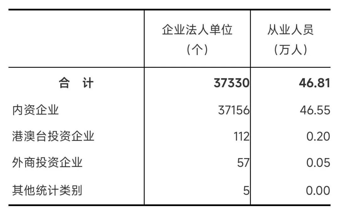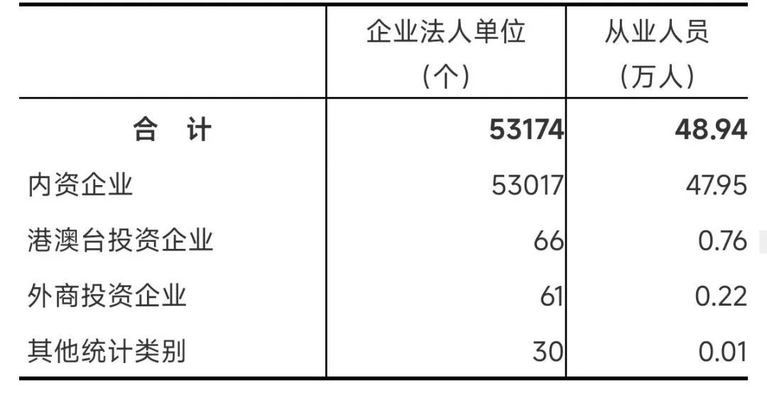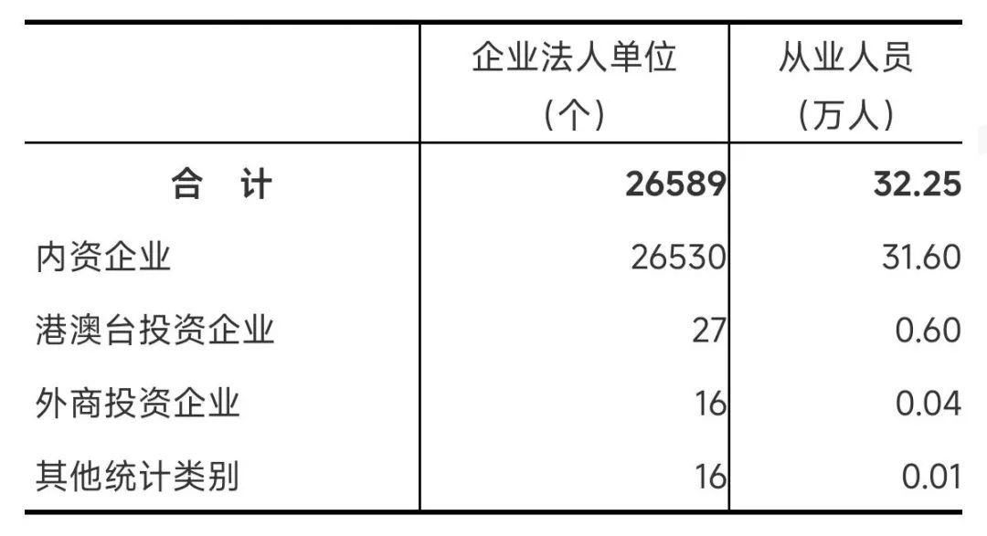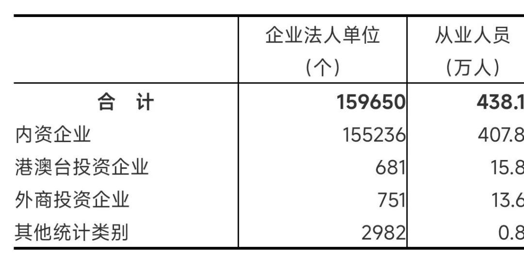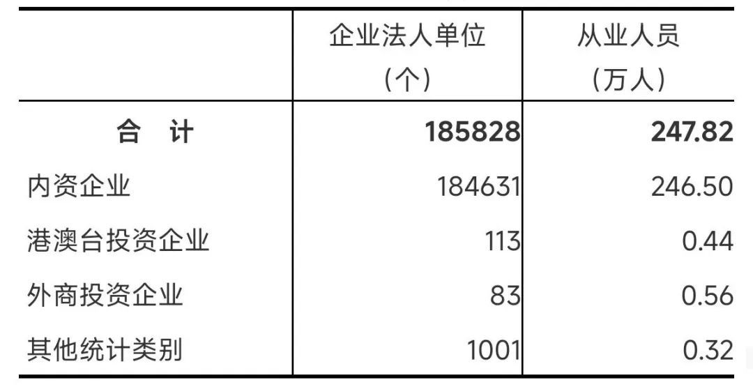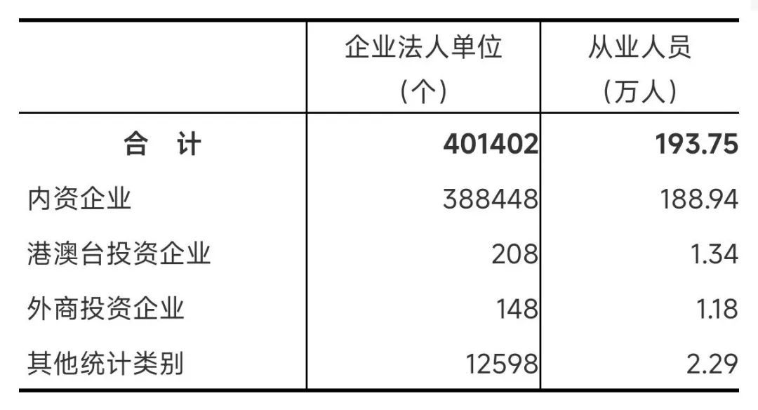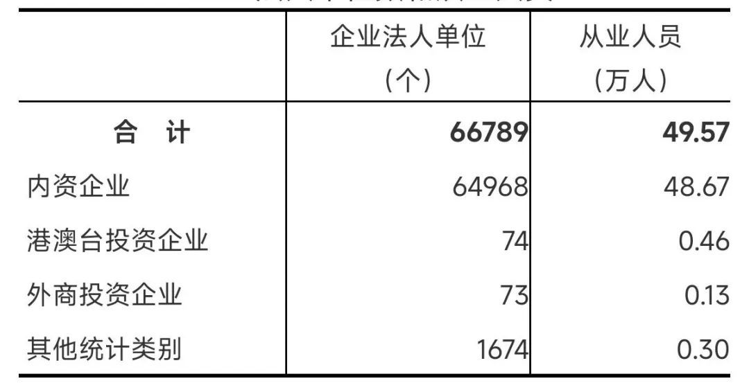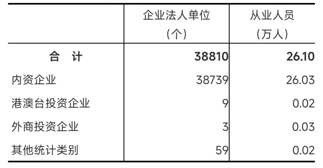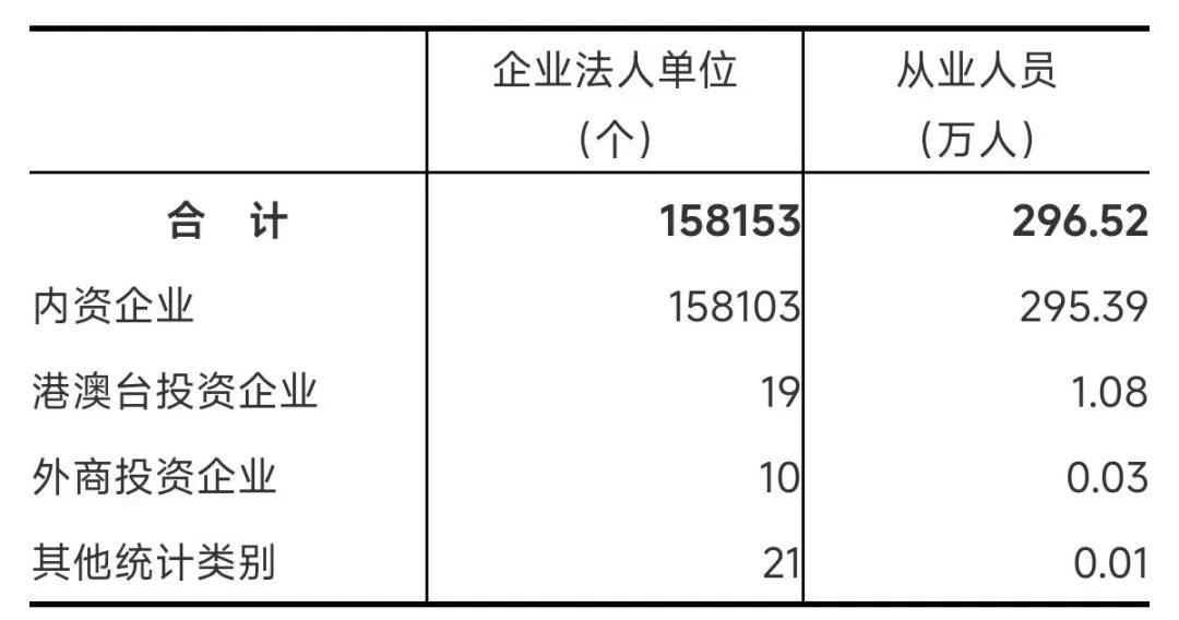 在工业企业法人单位中,内资企业155236个,占97.2%;港澳台投资企业681个,占0.4%;外商投资企业751个,占0.5%。