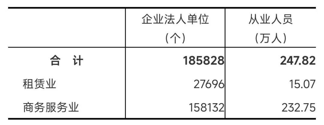 在第二产业和第三产业法人单位从业人员中,位居前三位的行业是:制造业409.44万人,占23.1%;建筑业295.58万人,占16.7%;租赁和商务服务业248.91万人,占14%。在个体经营户从业人员中,位居前三位的行业是:批发和零售业342.83万人,占38.8%;住宿和餐饮业104.9万人,占11.9%;制造业101.53万人,占11.5%(详见表2)。