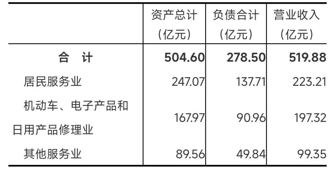2023年末,居民服务、修理和其他服务业企业法人单位资产总计504.6亿元,比2018年末增长38.8%;负债合计278.5亿元,比2018年末增长84.3%。全年实现营业收入519.88亿元,比2018年增长116.0%(详见表15-3)。
