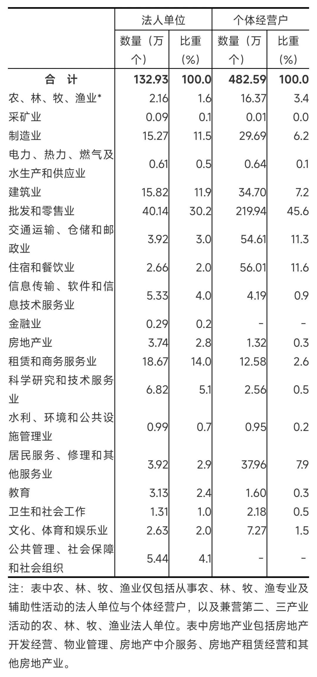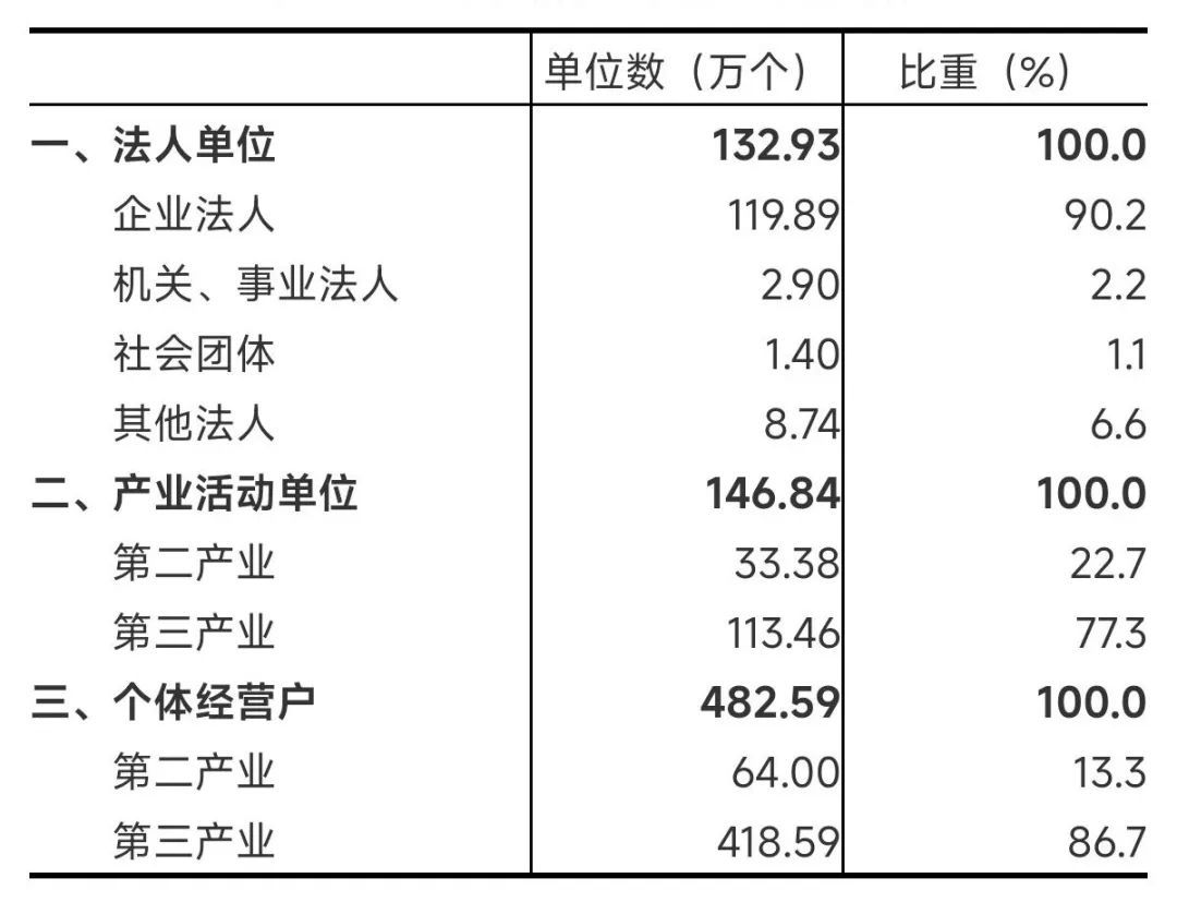 2023年末,全省共有从事第二产业和第三产业活动的法人单位132.93万个,比2018年末增加51.6万个,增长63.4%;产业活动单位[1]146.84万个,增加52.39万个,增长55.5%;个体经营户482.59万个,增加103.77万个,增长27.4%(详见表1-1)。