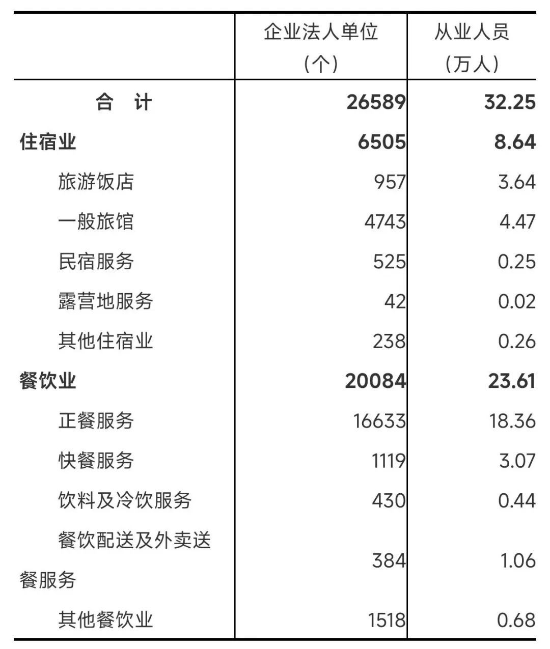 2023年末,全省共有住宿和餐饮业企业法人单位26589个,从业人员32.25万人,分别比2018年末增长58.9%和32.4%。