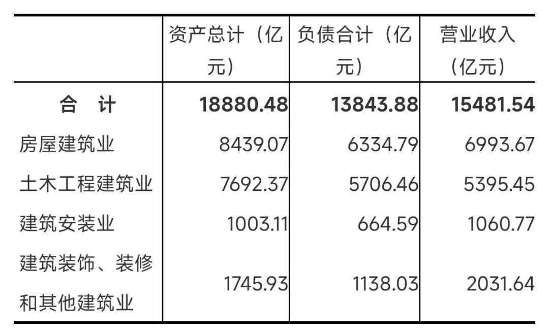 2023年末,建筑业企业法人单位资产总计18880.48亿元,比2018年末增长100.0%;负债合计13843.88亿元,比2018年末增长135.4%。