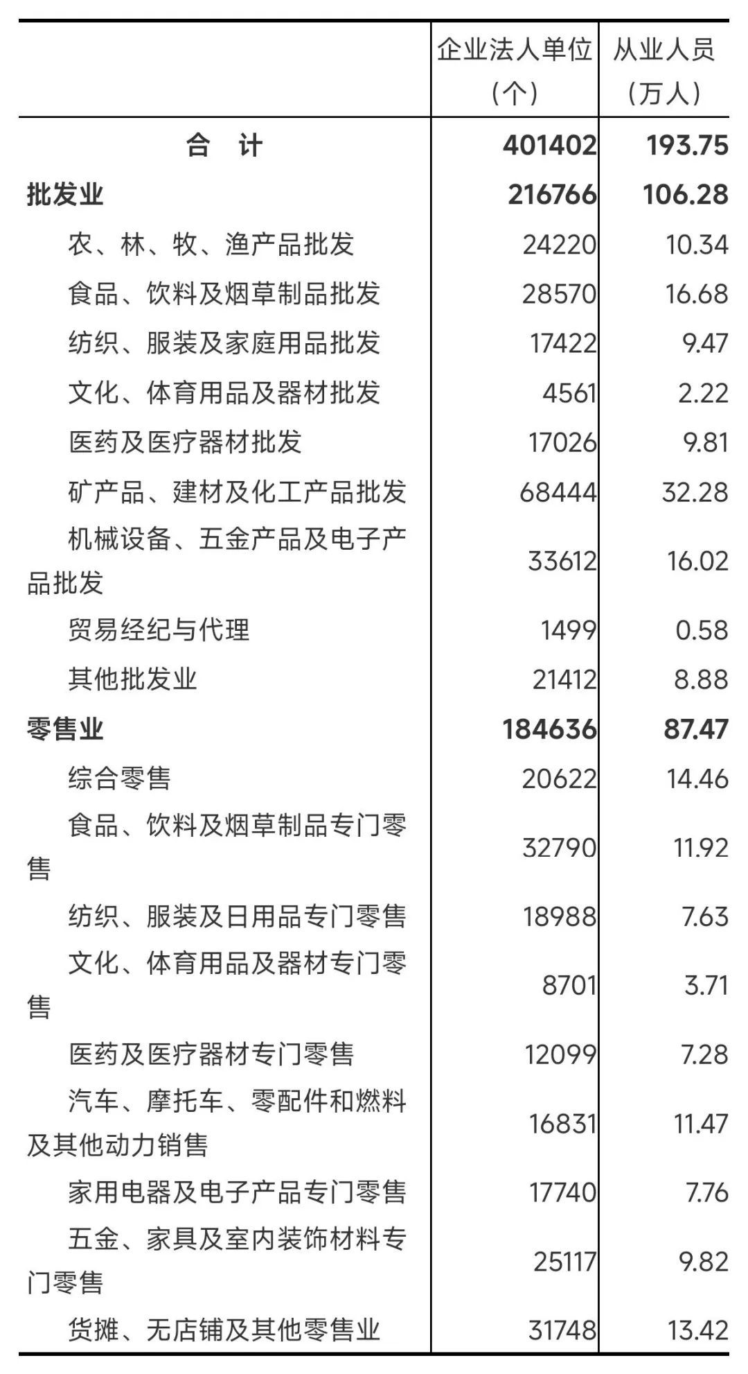 2023年末,全省共有批发和零售业企业法人单位401402个,从业人员193.75万人,分别比2018年末增长65.8%和39.3%。