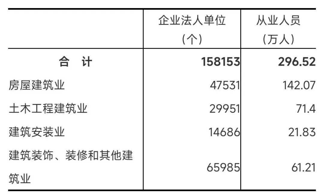 2023年末,全省共有建筑业企业法人单位158153个,比2018年末增长153.2%;从业人员296.52万人,比2018年末增长13.9%。