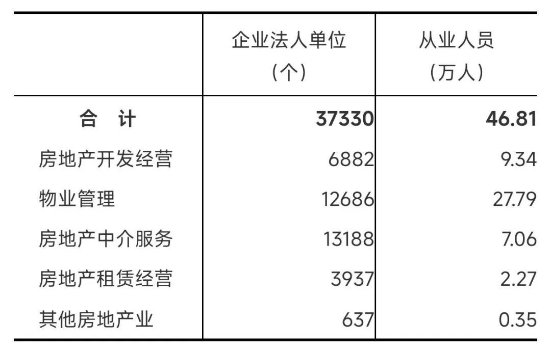 2023年末,全省共有房地产业企业法人单位37330个,比2018年末增长40.3%。其中,房地产开发经营企业6882个,比2018年末下降5.6%;物业管理企业12686个,房地产中介服务企业13188个,分别比2018年末增长43.5%和64.1%。