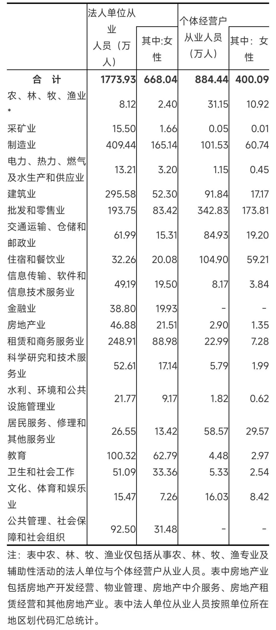 表2 按行业门类分组的法人单位与个体经营户从业人员