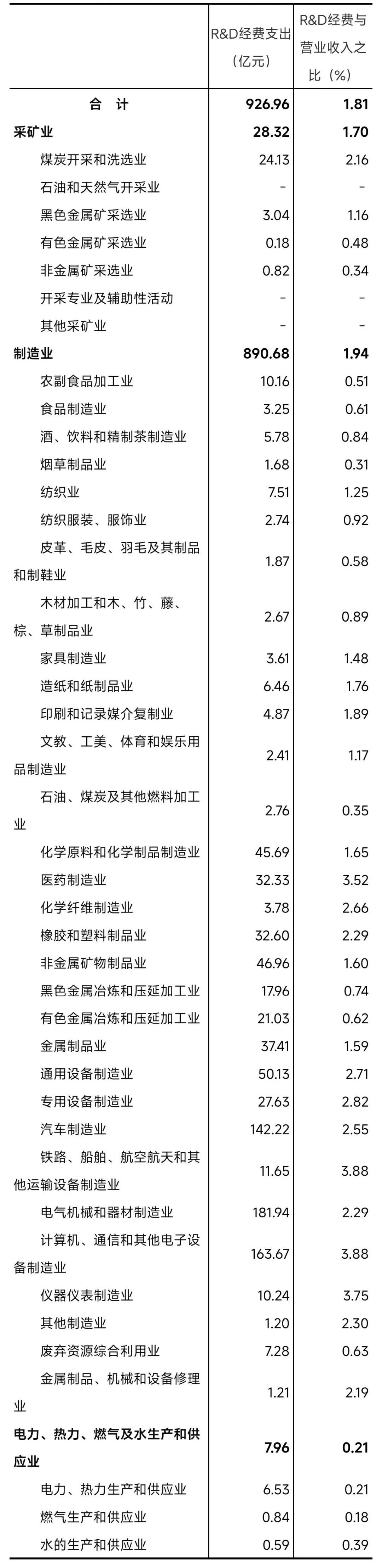 2023年,规模以上工业企业法人单位R&D经费支出926.96亿元,比2018年增长86.4%;R&D经费与营业收入之比为1.81%。规模以上工业企业法人单位分行业R&D经费支出及R&D经费与营业收入之比详见表23。